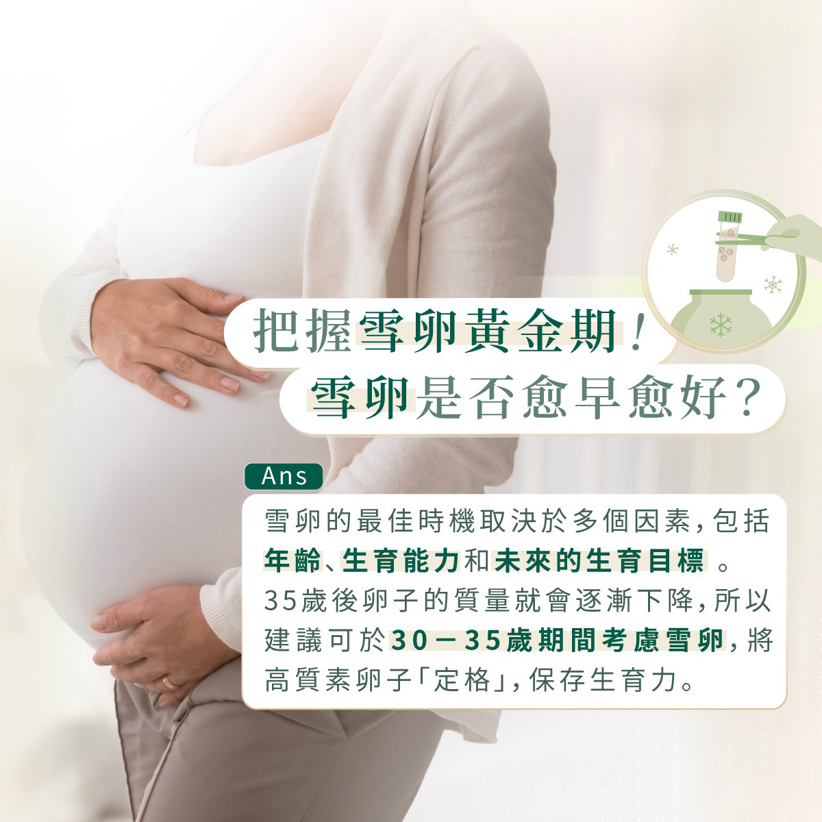 答:隨着卵子低溫保存技術不斷進步,現代女士可選擇在年輕、適齡時冷凍卵子,為日後懷孕生育作準備。在香港,卵子一般最長可儲存10年(癌症患者可儲存至55歲,時間以較遲者為準),故建議女士不應過早或過遲進行卵子冷凍。