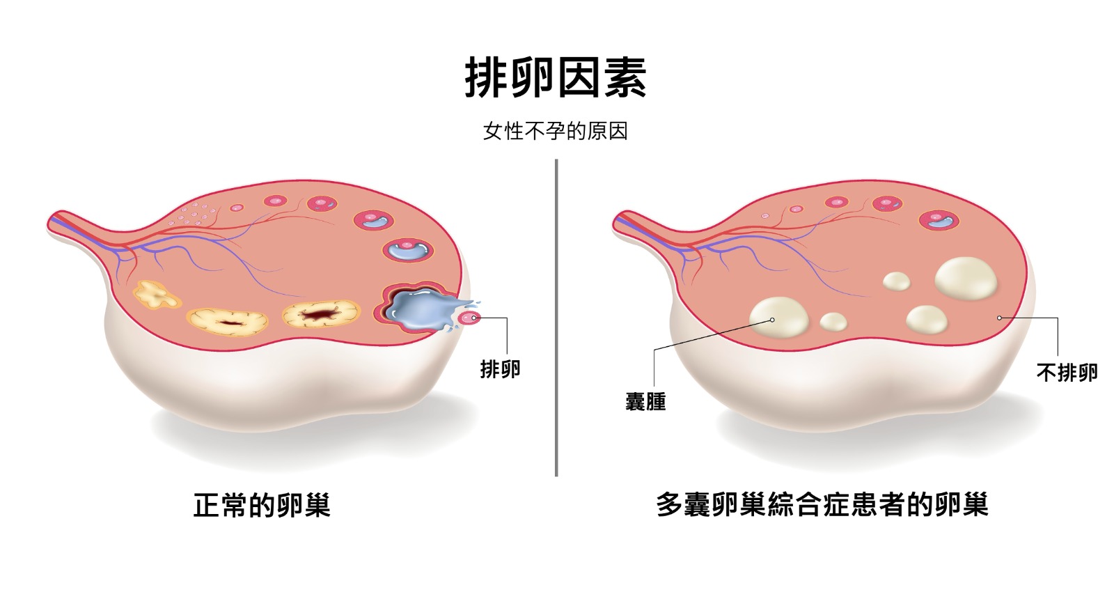 是的,你沒有聽錯,多囊卵巢綜合症可引致不孕。這是因為在女性的生殖系統中,每個月會有一顆優勢卵泡,在卵巢內長大、成熟、排出成為卵子等待受孕。而多囊卵巢綜合症患者的卵巢中,有很多不成熟的卵泡,不會定時長大和排卵,造成排卵障礙,進而影響受孕。