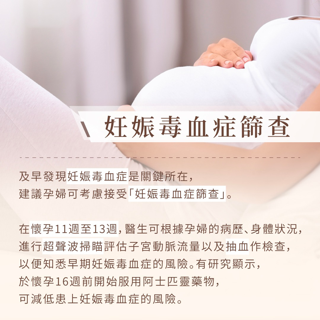 在2017年發表的一項大型臨床研究中,從懷孕11-14週開始,每天使用150毫克低劑量的阿士匹靈,可以將於34週前發生妊娠毒血症的機率降低80%。進一步研究分析,若在懷孕16週或之前開始,則每日使用阿士匹靈劑量≥100mg才有效。因此,在懷孕11-13週之間,安排妊娠毒血症篩查最為有效。