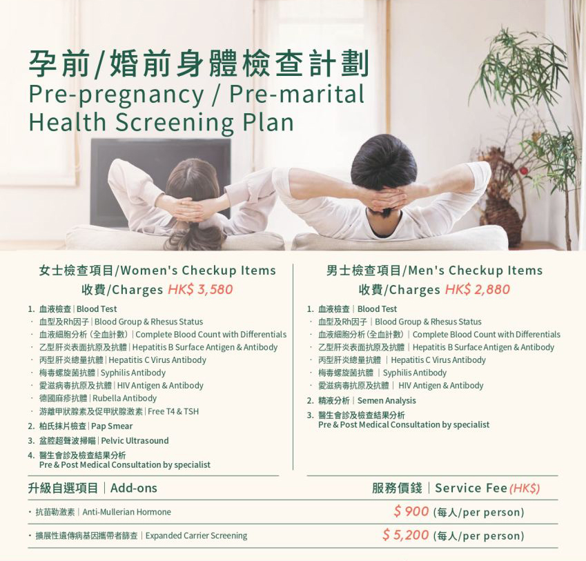 - 孕前檢查:孕前身體檢查主要透過各項檢查項目,為計劃生育的夫婦全面評估雙方的健康狀況及生育能力,確保身體狀況適合懷孕。與一般身體檢查相比,更著重生育能力及遺傳病檢測,以及早找出有機會影響胎兒發展的因素和隱性遺傳疾病。如發現有生育能力問題,可及早對症下藥,接受治療,以免錯過生育的黃金時間